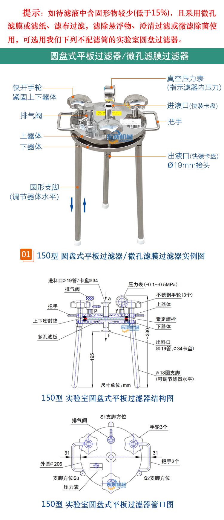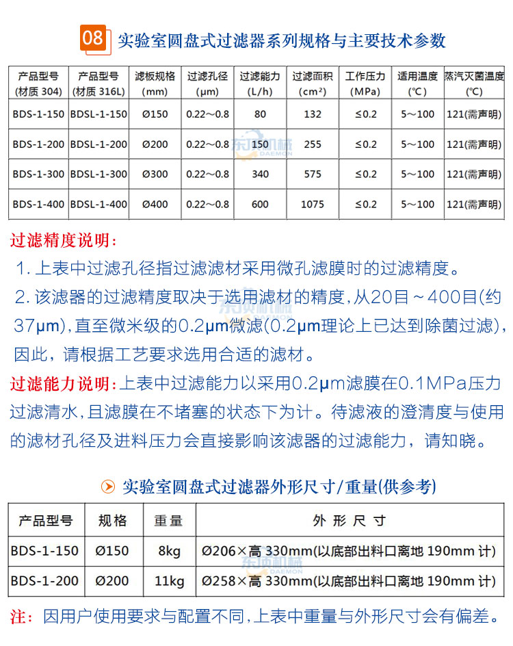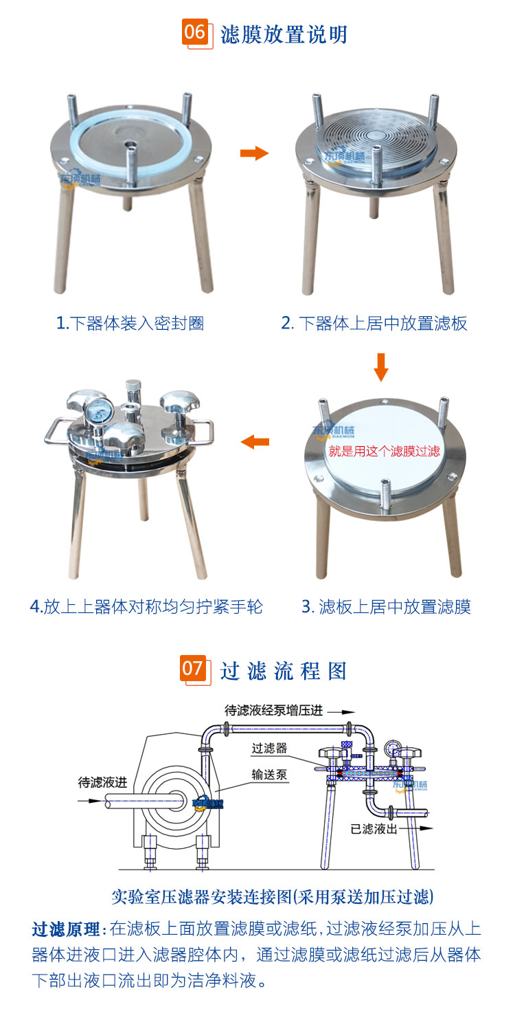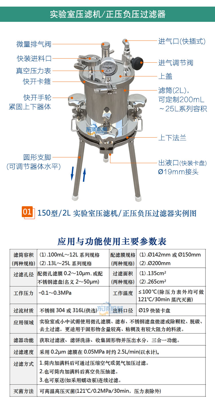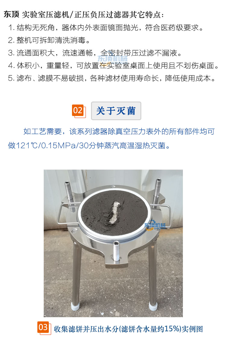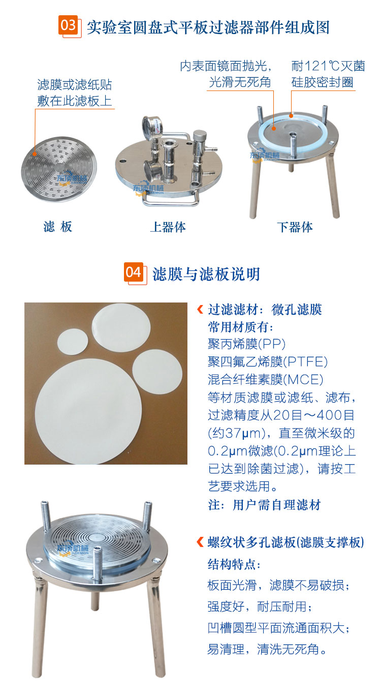 东顶圆盘式微孔滤膜过滤器/正压过滤器/真空负压抽滤器适用于生物制品、医药、酿酒、食品饮料等行业的少量料液进行微滤除菌、除颗粒或澄清过滤、收集固形物并压出滤饼中水分及科研小、中试使用的实验室过滤器。该滤器可根据被滤液体的不同生产工艺(粗滤、精滤)要求,更换不同滤材进行过滤。