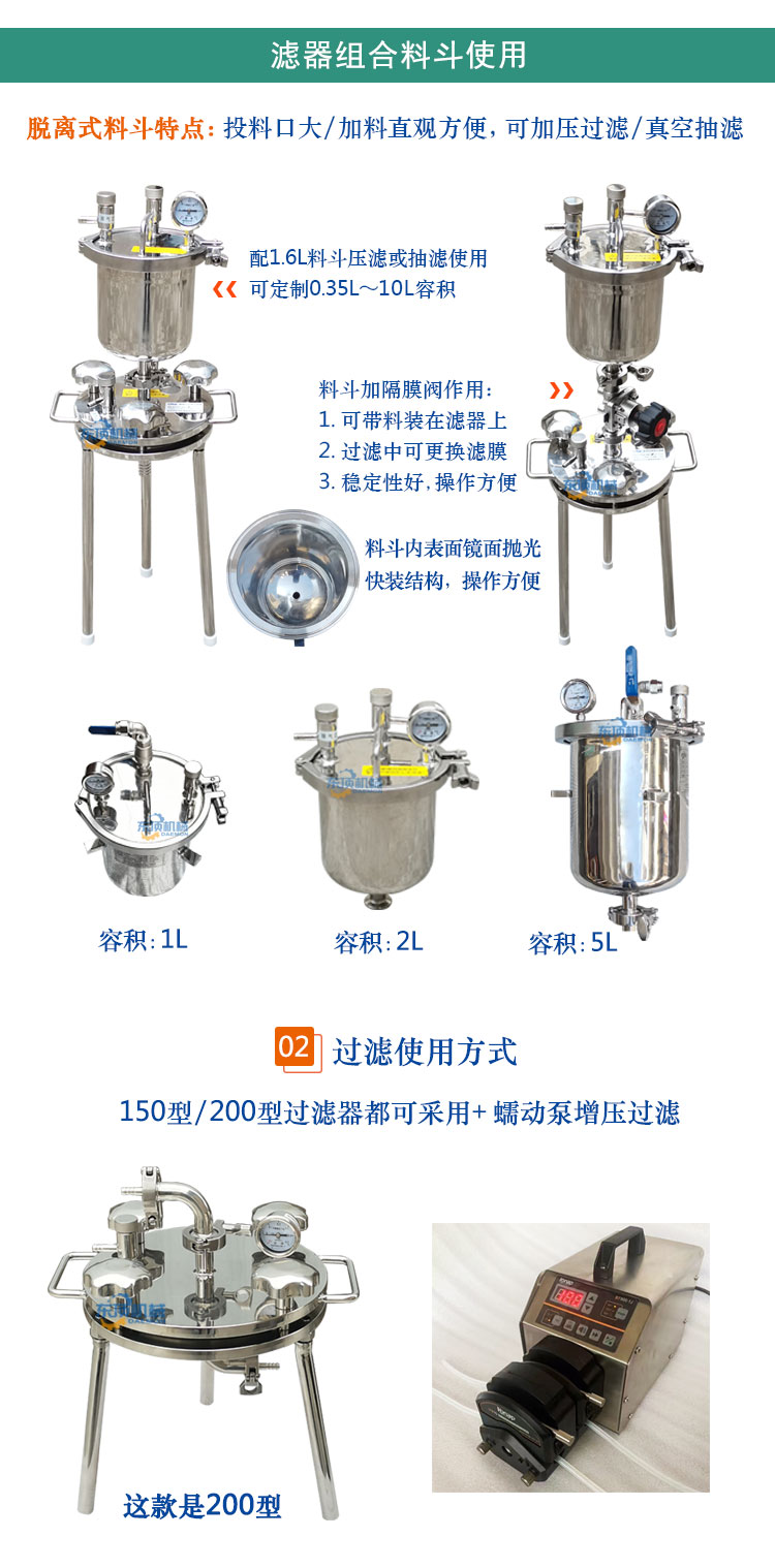二、使用条件:需配套压力源,该滤器可由压力罐、蠕动泵、压缩空气、氮气或真空泵做为压力源进行正压或负压过滤。