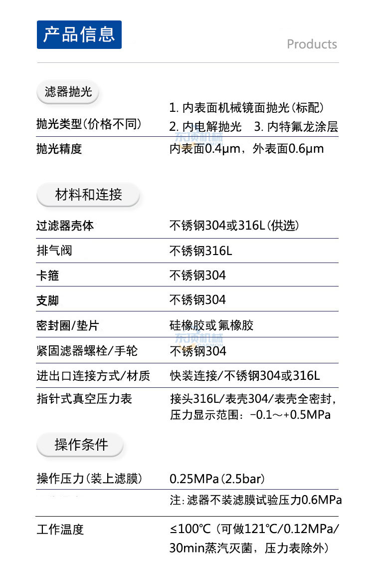 注:上表中过滤孔径指过滤滤材采用微孔滤膜时的过滤精度。