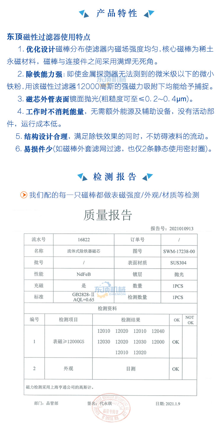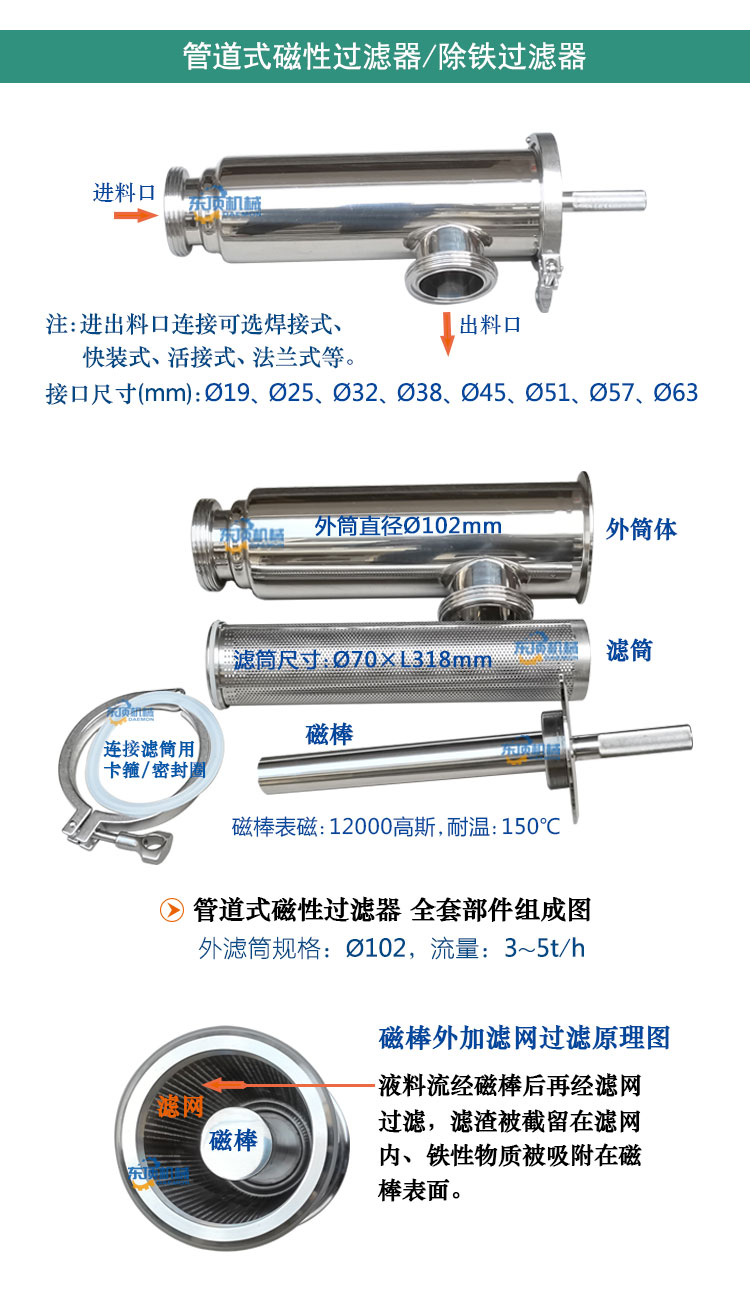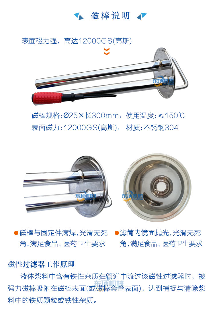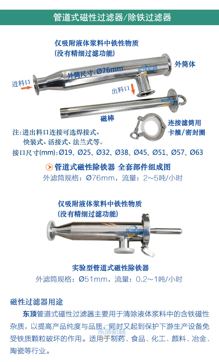 东顶管道式磁性除铁过滤器主要用于清除液体浆料中的含铁磁性杂质,以提高产品纯度与品质,同时又起到保护下游生产设备免受铁质颗粒破坏的作用。适用于制药、食品、化工、颜料、冶金、陶瓷等行业。