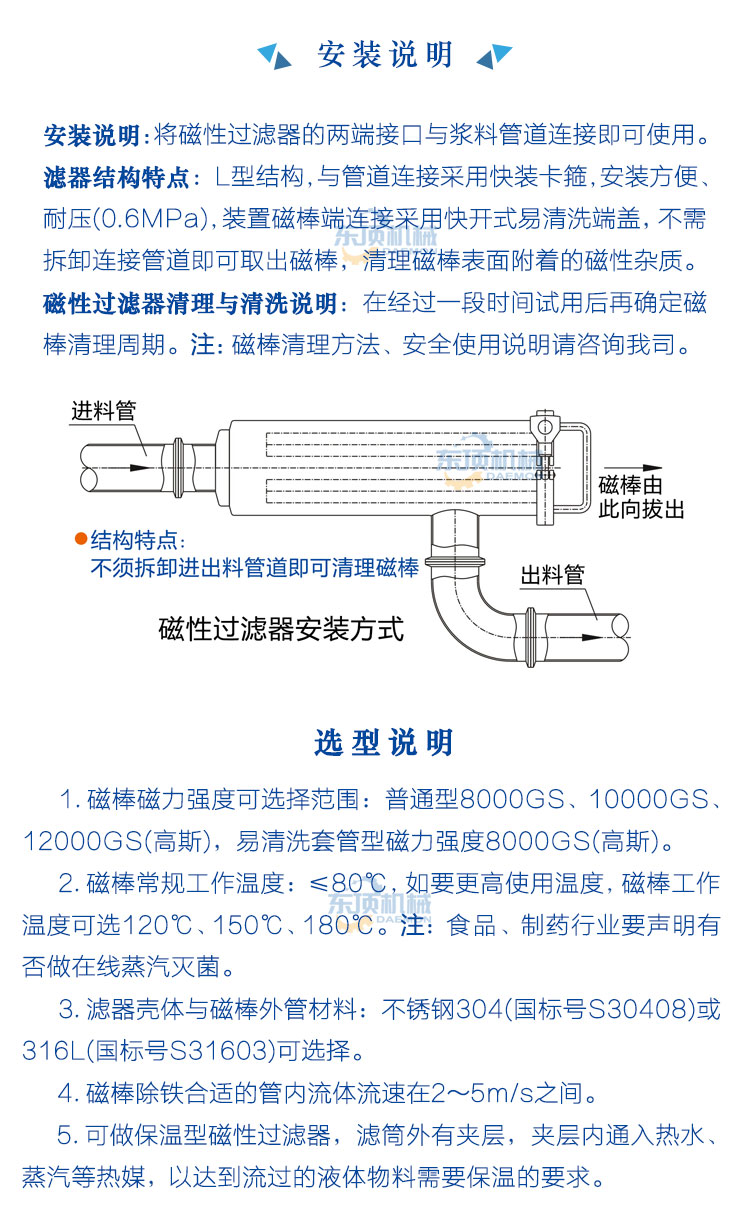 东顶磁性过滤器使用特点、磁性过滤器选型说明、磁性过滤器清理与清洗说明