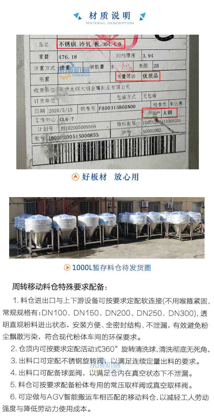 东顶公司专业制造各类不锈钢周转料仓 周转料斗 不锈钢移动料斗 粉体移动料仓 干粉料仓圆形料仓 转运料仓 粉体周转罐 移动中转罐 称重料仓 计量料仓 破拱料斗 混合料斗 振(震)动料斗料仓 中转料仓 中转料斗 粉料中转料桶 密封料仓 密封料斗 粉体料仓 不锈钢料仓 锥形料仓 转料仓 粉体转料车 粉体转料箱 移动料车 搅拌料仓 搅拌混合干燥料仓 暂存料仓 缓存料仓 缓冲料仓 中间料仓