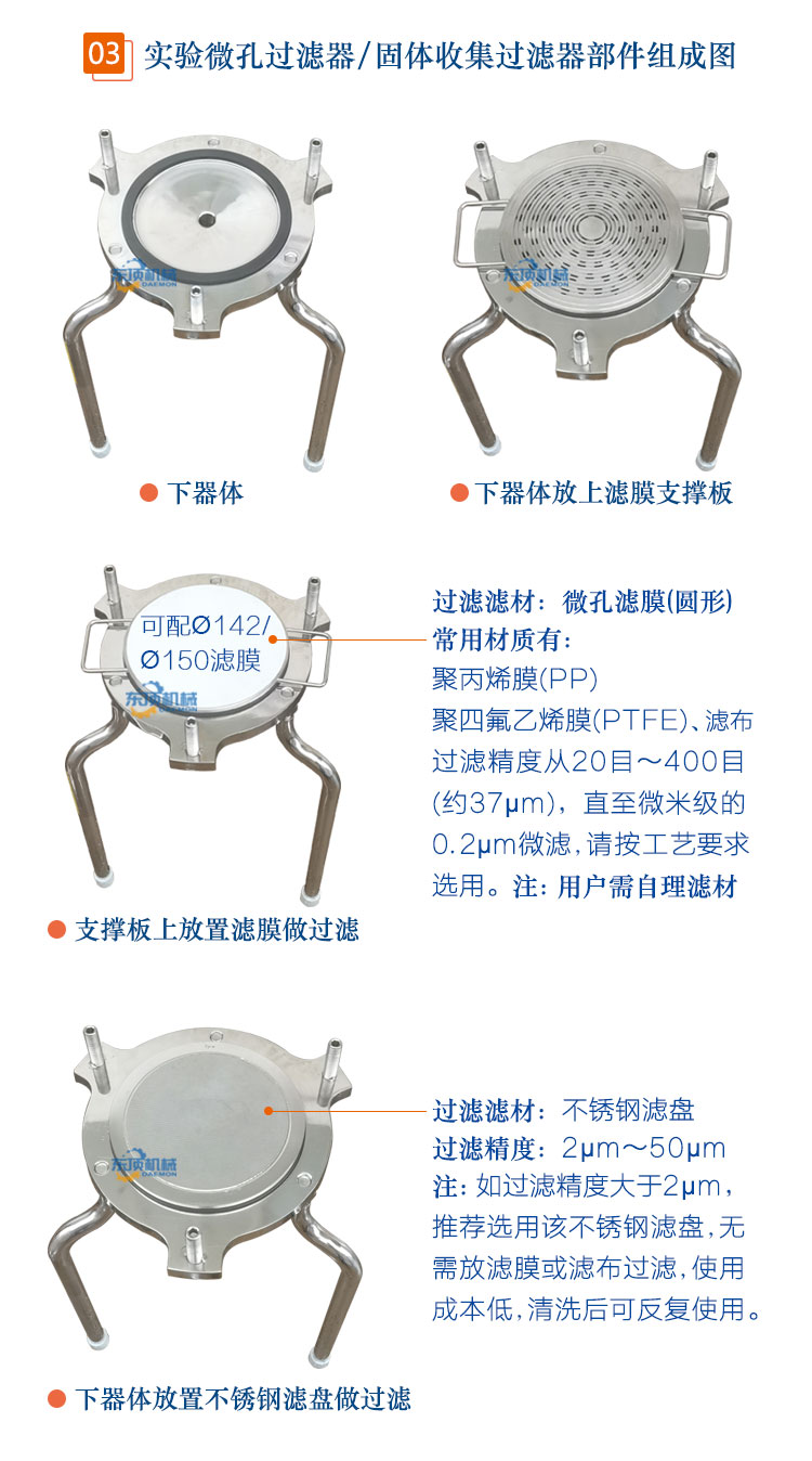 ●可适配不同孔径滤材,如:圆形滤膜(0.2~10μm)、滤布(10~400目)、不锈钢滤盘(名义过滤孔径2~50μm)过滤。