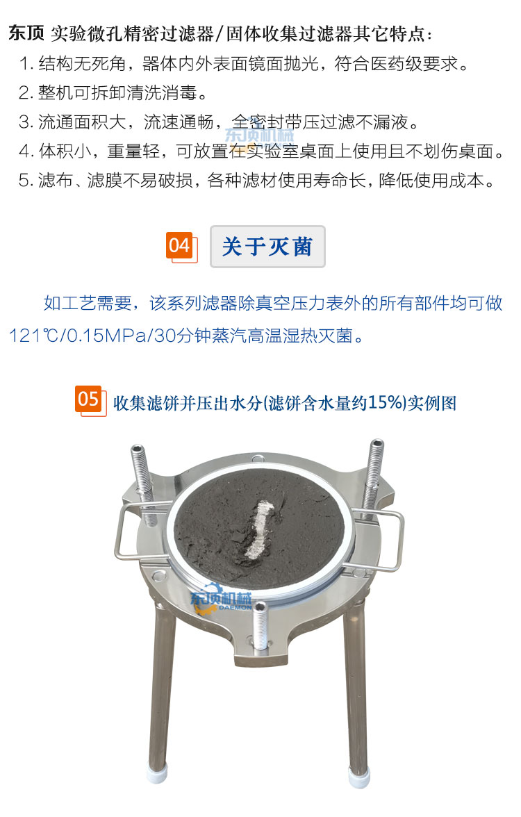 东顶——固液分离过滤器又名双相收集过滤器、真空负压抽滤器、微孔滤膜正压过滤器,由单层或双层圆盘平板+滤筒组成,适用于生物制品、医药、新能源、食品饮料等行业的少量料液进行除颗粒或澄清过滤、微滤除菌、收集固形物并压出水分及科研小、中试使用的实验室过滤器。
