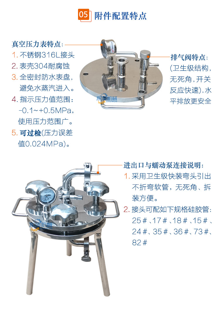 二、使用条件:需配套压力源,该滤器可由压力罐、蠕动泵、压缩空气、氮气或真空泵做为压力源进行正压或负压过滤。