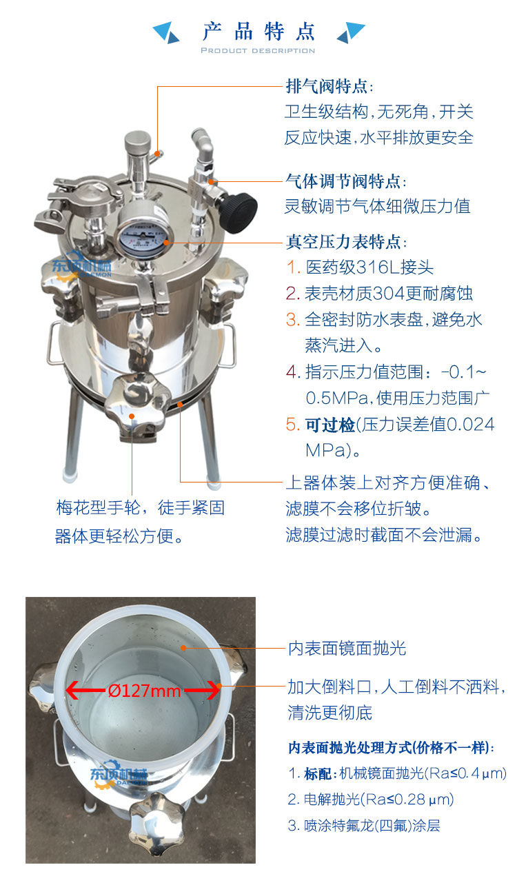 东顶圆盘式微孔滤膜过滤器/正压过滤器/真空负压抽滤器适用于生物制品、医药、酿酒、食品饮料等行业的少量料液进行微滤除菌、除颗粒或澄清过滤、收集固形物并压出滤饼中水分及科研小、中试使用的实验室过滤器。该滤器可根据被滤液体的不同生产工艺(粗滤、精滤)要求,更换不同滤材进行过滤。