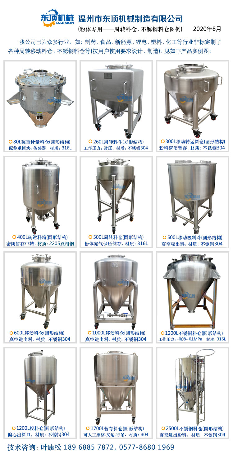 东顶公司专业制造各类不锈钢周转料仓、周转料斗(料仓 料斗 不锈钢移动料斗 粉体移动料仓 干粉料仓 方形料仓 圆形料仓 转运料仓 粉体周转罐 移动中转罐 粉体周转料仓 粉体周转料斗 破拱料斗 混合料斗 粉体转料箱 振(震)动料斗料仓) 中转料仓 中转料斗 中转料桶 密封料仓 密封料斗 粉体料仓 锥形料仓 转料仓 暂存料仓 缓存料仓 缓冲料仓 粉体料斗 粉体转料车 移动料车 不锈钢料仓 料仓设备