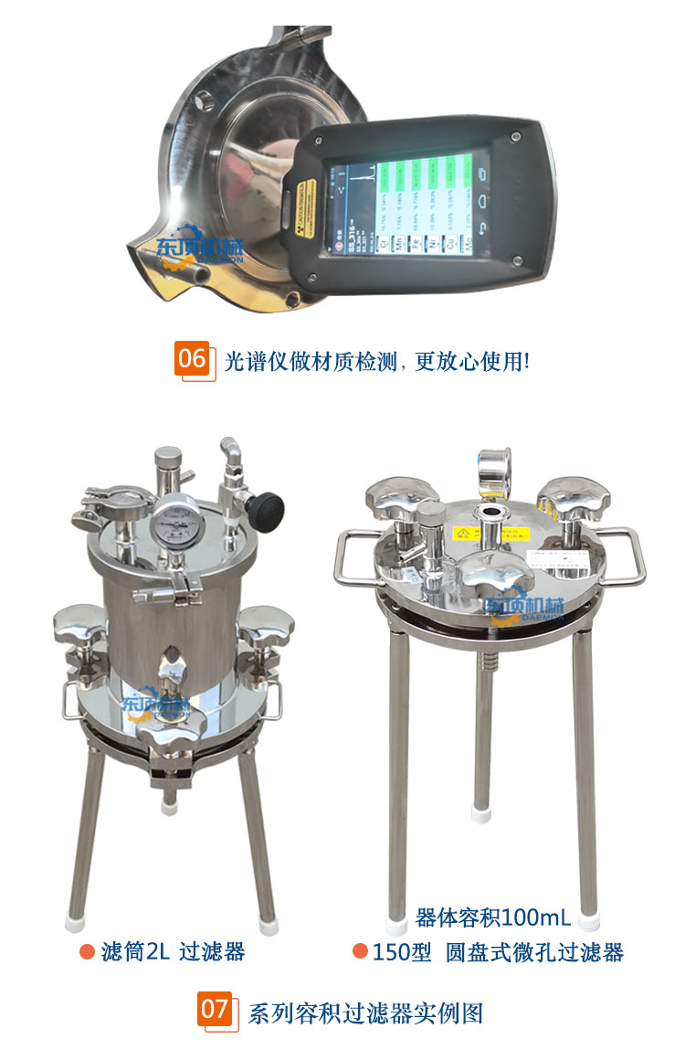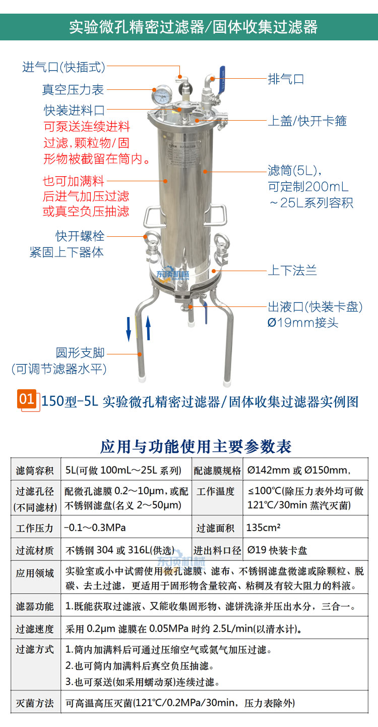 东顶——固液分离过滤器又名双相收集过滤器、真空负压抽滤器、微孔滤膜正压过滤器,由单层或双层圆盘平板+滤筒组成,适用于生物制品、医药、新能源、食品饮料等行业的少量料液进行除颗粒或澄清过滤、微滤除菌、收集固形物并压出水分及科研小、中试使用的实验室过滤器。