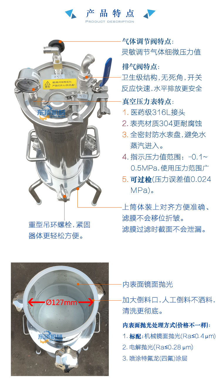 (1)筒内加满料后可通过压缩空气、氮气加压过滤。